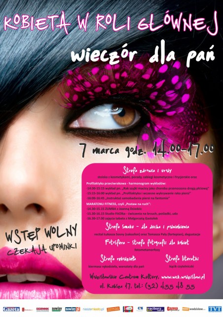 W sobotę, 7 marca wszystkie Panie będą mogły skorzystać z bogatej oferty Wodzisławskiego Centrum Kultury. Od godziny 14.00 do 17.00 wnętrze WCK zamieni się w strefy przeznaczone dla pań. Wejście na tą część imprezy jest bezpłatne, a na pierwsze uczestniczki czekają upominki.