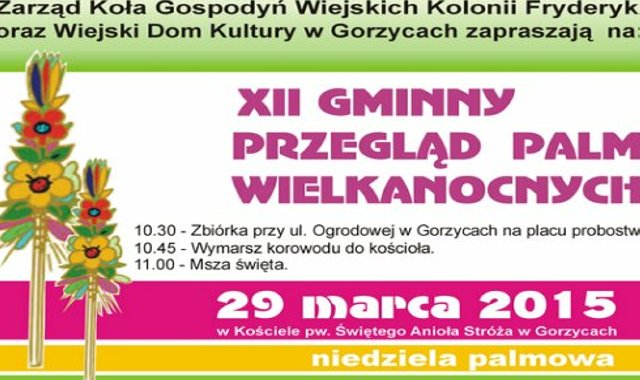 Zarząd Koła Gospodyń Wiejskich Kolonii Fryderyk oraz Wiejski Dom Kultury w Gorzycach zapraszają na Przegląd Palm Wielkanocnych w niedzielę palmową.