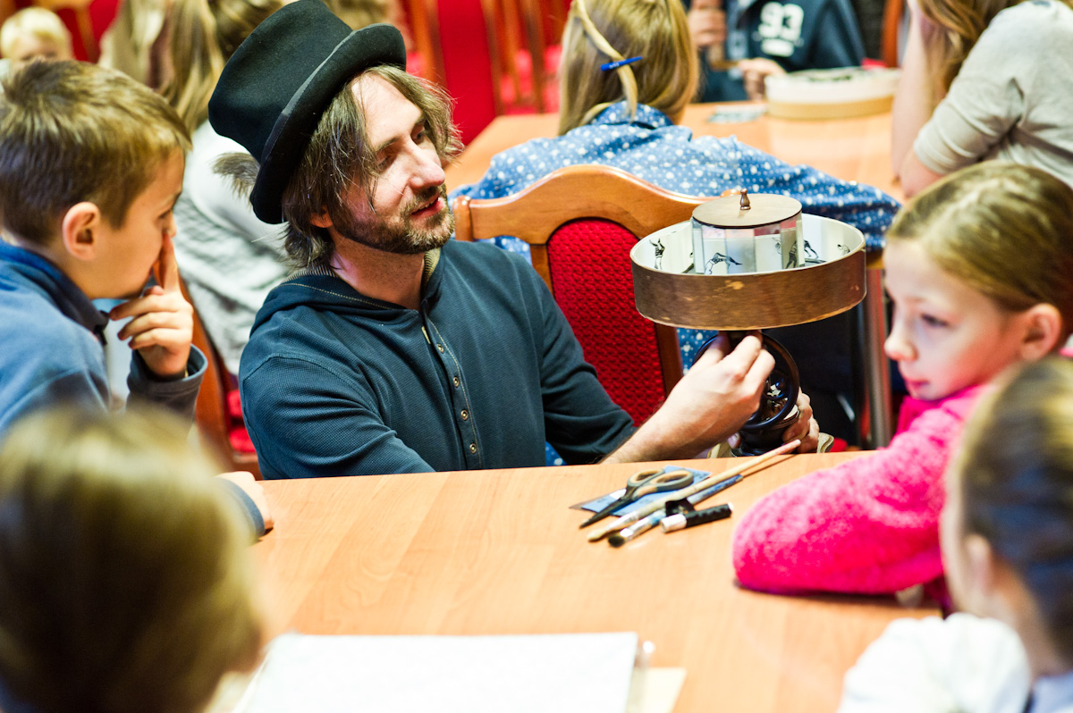 Laterna Magica (Latarnia Magiczna) to pierwszy aparat projekcyjny wynaleziony w XVII w. przez jezuitę A. Kirchera. Stała się następczynią Camery Obscura, pierwowzorem rzutników do slajdów, diaskopów i kamer filmowych. Obecnie tradycja latarni powraca. Pojawiają się projekty parateatralne, znajdujące się na pograniczu filmu, animacji i teatru – tak też było podczas spotkania z Grzegorzem Ptakiem i jego magicznymi urządzeniami. Mali uczestnicy, którzy brali udział w tym magicznym spektaklu, przenieśli się w zaczarowany świat pierwszych seansów projekcyjnych, do świata pierwotnych technik animacji i projekcji. Każdy z młodych animatorów na chwilę stał się magikiem – iluzjonistą, a efekt swojej pracy na warsztatach mógł zaprezentować rodzinie i kolegom podczas wieczornego seansu na maszynie skonstruowanej przez siebie samego.