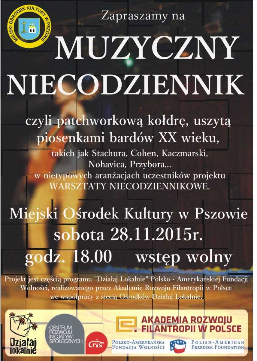 Koncert zorganizowany przez autorów Muzycznego Niecodziennika – nazwany patchworkową kołdrą uszytą piosenkami bardów, takich jak Stachura, Cohen, Kaczmarski, Nohavica, Przybora w niecodziennych aranżacjach – jest częścią projektu pt. „Warsztaty Niecodziennikowe", realizowanego w ramach programu „Działaj lokalnie" Polsko-Amerykańskiej Fundacji Wolności (więcej o projekcie w materiałach zamieszczonych w załącznikach oraz na https://www.facebook.com/events/862402530473572/).