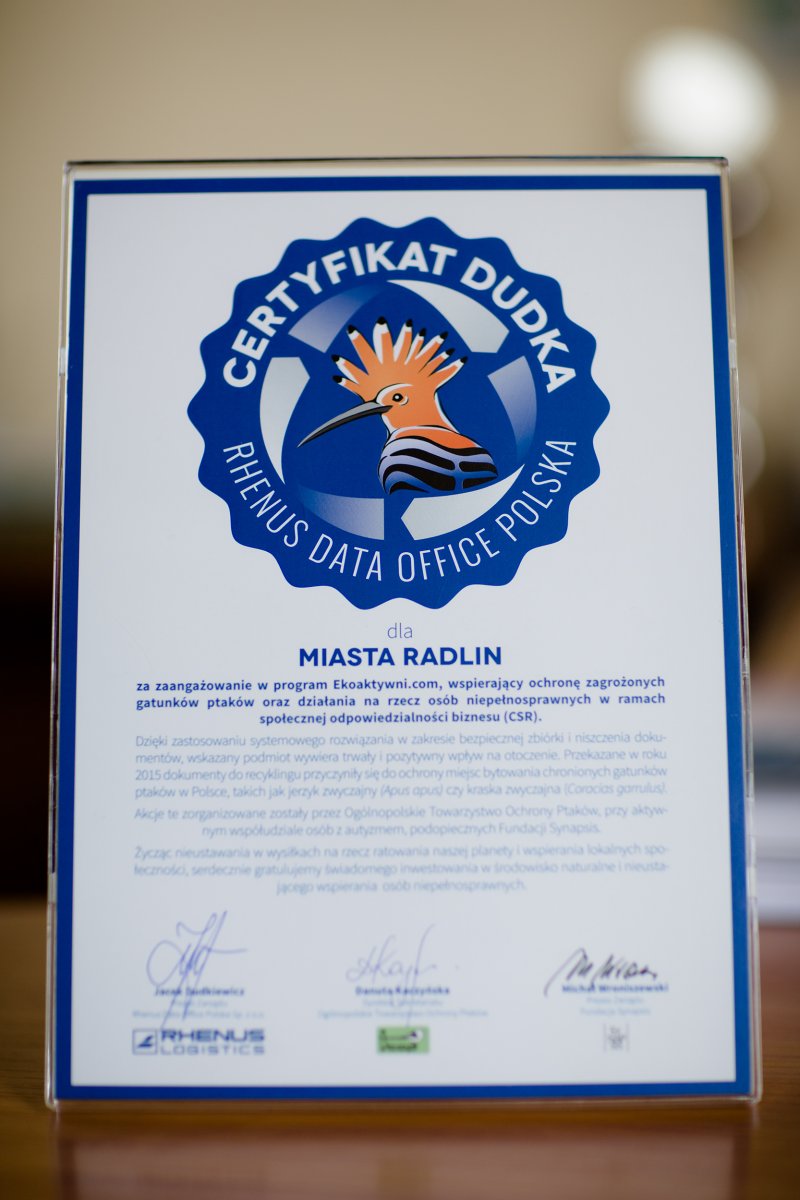 "Certyfikat Dudka", którym od teraz pochwalić się może miasto Radlin, przyznawany jest przez Ogólnopolskie Towarzystwo Ochrony Ptaków oraz Fundację Synapsis.