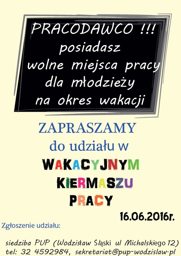 Wszyscy pracodawcy, którzy posiadają wolne miejsca pracy dla młodzieży na okres wakacyjny, mogą zgłosić swój udział w wydarzeniu w siedzibie PUP (ulica Michalskiego 12), pod numerem telefonu: 32 45 92 984 lub drogą elektroniczną (e-mail: [email protected]).