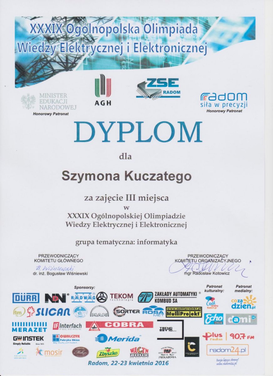 Paweł Długosz zajął drugie miejsce w grupie elektroników, a Szymon zakończył rywalizację na trzecim miejscu w grupie informatycznej. Uczniowie uzyskali tytuł laureata i zapewnili sobie indeksy Akademii Górniczo-Hutniczej im. S. Staszica w Krakowie.