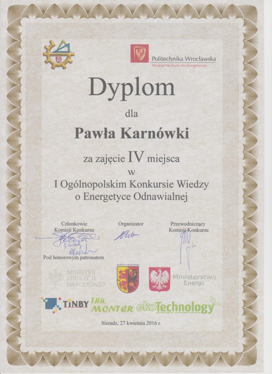Patronem merytorycznym konkursu był Wydział Mechaniczno-Energetyczny Politechniki Wrocławskiej. Uczniów przygotowywali nauczyciele: Aleksandra Prudel i Rafał Grochowiak.
