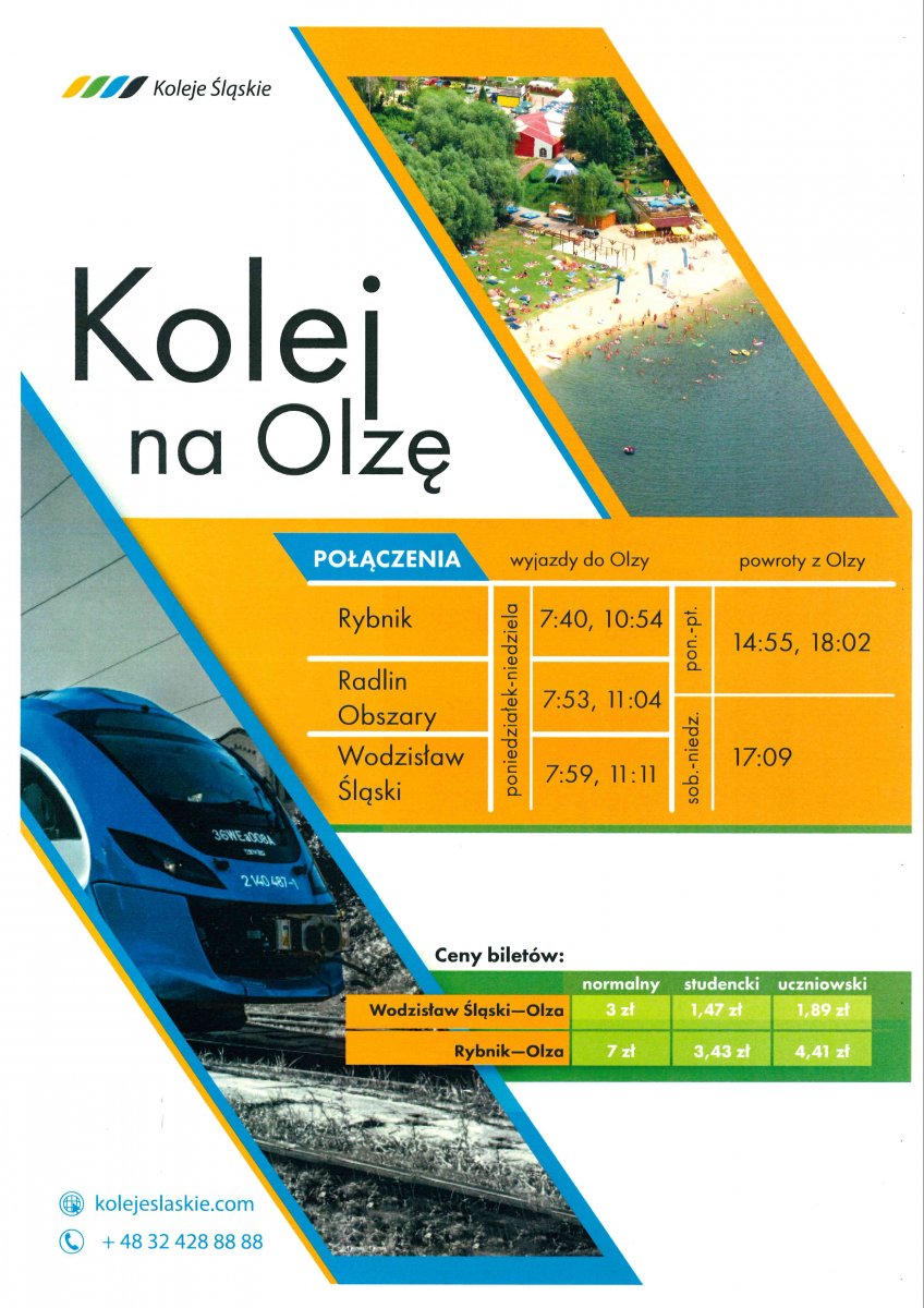 Pociągi z Wodzisławia Śląskiego do Olzy jeżdżą każdego dnia tygodnia, o godzinach: 7:59 i 11:11. W tygodniu, powrotne kursy przewidziano o godzinach 14:55 i 18:02, a w weekend – o 17:09. Normalny bilet do Olzy kosztuje jedynie 3 zł! Uczniowie mają obowiązek zapłacić 1,89 zł, a studenci – 1,47 zł. Podany rozkład jest ważny do 3 września.