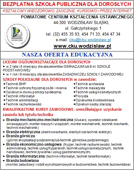 PCKU Wodzisław: Szkoła, liceum, kursy - oferta. Nabór