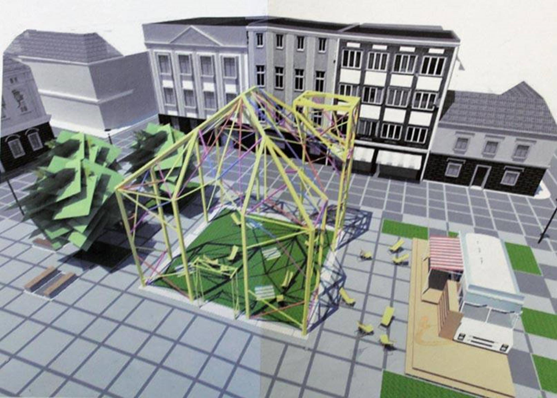 Szkieletowy model odwzorowujący ratusz i food truck
