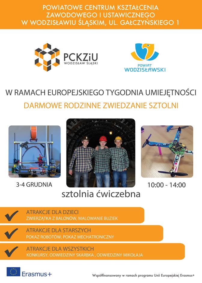 Weekend z zawodem i zabawą w Powiatowym Centrum Kształcenia Zawodowego i Ustawicznego w Wodzisławiu Śląskim zaplanowano na 3 i 4 grudnia, w godzinach od 10:00 do 14:00. Oprócz zwiedzania sztolni, dla gości przewidziano również m.in. malowanie dziecięcych twarzy, wspólne tworzenie zwierząt z balonów, pokazy robotów i mechatroniki, a także konkursy, wizytę Skarbka oraz Mikołaja.