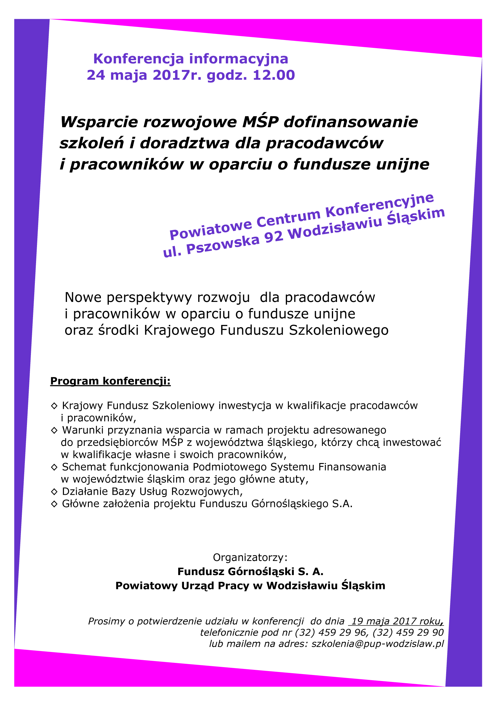 Konferencja odbędzie się 24 maja, o godz. 12:00, w Powiatowym Centrum Konferencyjnym w Wodzisławiu Śląskim (ul. Pszowska 92A). Szczegóły dot. wydarzenia znajdziecie na plakacie powyżej.